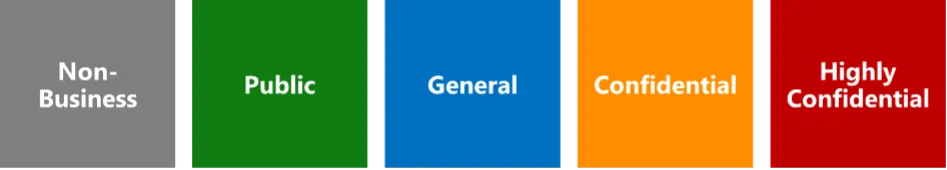 Om data te voorzien van het juiste label, wordt gebruik gemaakt van een gegevensclassificatiemodel. Een veelgebruikte variant is bijvoorbeeld het 5-laagse model, zoals hieronder afgebeeld. Dit model maakt het mogelijk zowel niet-zakelijke als zakelijke data te onderscheiden. Zakelijke gegevens zijn vervolgens onderverdeeld in algemene, confidentiële en hoog confidentiële informatie.