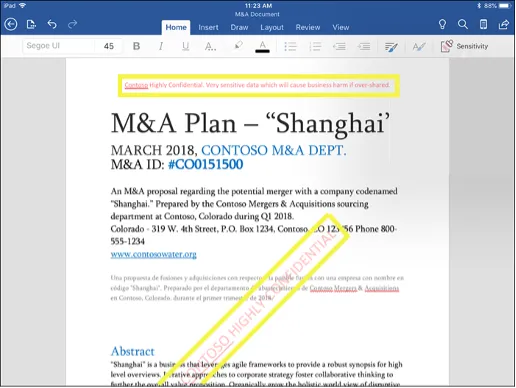 Maar hoe werken die gevoeligheidslabels na het kiezen van een model nou in de praktijk? Nadat een medewerker een label heeft gekozen voor een e-mailbericht of document, wordt het bijbehorende beleid afgedwongen. Zo kan een document gemarkeerd als ‘hoog confidentieel’ automatisch van visuele markeringen voorzien worden, zoals weergegeven in het voorbeeld hieronder. Voor e-mailberichten voorzien van een classificatie kan bijvoorbeeld afgedwongen worden dat deze versleuteld worden verzonden en het doorsturen ervan wordt geweigerd.