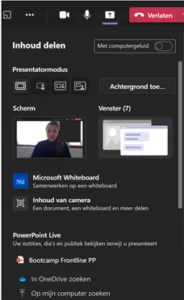 Wanneer je op deze knop drukt krijg je verschillende opties te zien, namelijk: ‘Scherm’, ‘Venster’, ‘Microsoft Whiteboard’, ‘Inhoud van camera’ en ‘PowerPoint Live’.