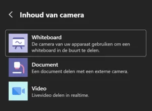 Met behulp van ‘Inhoud van camera’ zorg je ervoor dat personen die niet fysiek aanwezig zijn bij de vergadering zich meer betrokken voelen. Met de optie ‘Whiteboard’ wordt er op het whiteboard ingezoomd en kan je toch meelezen, zelfs vanaf je mobiel. ‘Document’ wordt gebruikt om te focussen, met een externe camera, op een document, boek, werkblad et cetera. ‘Video’ kan je gebruiken om te focussen op overige voorwerpen. Zoals wanneer je een wetenschappelijk experiment demonstreert.